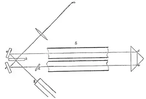 O rază de lumină provenind de la sursa S' se reflectă printr-un separator de fascicule(d) G și este colimată(d) într-un fascicul paralel de către lentila L. După trecerea prin fantele O1 și O2, două raze de lumină trec prin tuburile O1 și O2, prin care apa este curge înainte și înapoi așa cum este indicat de săgeți. Razele sunt reflectate de o oglindă m în focarul lentilei L', astfel încât o rază întotdeauna se propagă în același sens cu fluxul de apă, și cealaltă în sens opusă față de direcția curentului de apă. După trecerea înainte și înapoi prin tuburi, ambele raze se unesc în S, unde se produc franje de interferență, care pot fi vizualizate prin ocularul ilustrat. Modelul de interferență poate fi analizat pentru a determina viteza luminii de-a lungul fiecărui tub.[P 1][P 2][S 1]