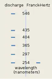 Franck și Hertz au remarcat în prima lor lucrare că energia caracteristică de 4,9 eV a experimentului lor corespunde bine cu una dintre lungimile de undă ale luminii emise de atomii de mercur în descărcările în gaz(d). Ei folosiseră o relație cuantică între energia de excitație și lungimea de undă corespunzătoare a luminii, pe care au atribuit-o în mare măsură lui Johannes Stark și lui Arnold Sommerfeld; ea prezice că 4,9 eV corespunde luminii cu o lungime de undă de 254 nm.[2] Aceeași relație a fost încorporată și în teoria fotonică a efectului fotoelectric elaborată de Einstein în 1905.[12] Într-o a doua lucrare, Franck și Hertz au consemnat emisia optică din tuburile lor,care emiteau lumină cu o singură lungime de undă proeminentă de 254 nm.[7] Figura din dreapta ilustrează spectrul unui tub Franck-Hertz; aproape toată lumina emisă are o singură lungime de undă. Pentru referință, figura prezintă și spectrul luminii unei descărcări în gaz de mercur, care emite lumină la câteva lungimi de undă în afară de 254 nm. Cifra se bazează pe spectrele originare publicate de Franck și Hertz în 1914. Faptul că tubul Franck-Hertz emitea doar o singură lungime de undă, care corespunde aproape exact perioadei de tensiune măsurată, era foarte important.[10]