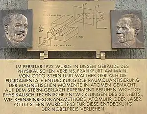 - Textul inscripției: În februarie 1922, în această clădire a asociației Physikalischer Verein, Otto Stern și Walther Gerlach au făcut descoperirea fundamentală a cuantificării în spațiu a momentelor magnetice din atomi. Pe experimentul Stern-Gerlach se bazează importante dezvoltări fizice-tehnice ale secolului 20, ca metoda rezonanței magnetice nucleare, ceasul atomic sau laserul. Pentru această descoperire, lui Otto Stern i-a fost acordat în 1943 Premiul Nobel.
