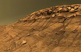 - Unele zone sunt acoperite de material bogat în hematit. Hematitul ar fi putut fi lăsat acolo de apă lichidă în trecut.[65]