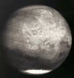 Lansată la 28 noiembrie 1964,[14] Mariner 4 a zburat pe lângă Marte la 14 iulie 1965, oferind primele fotografii de aproape ale unei alte planete. Cele 22 de fotografii de calitate medie realizate acoperă aproximativ 1% din suprafața lui Marte și dezvăluie un peisaj de tip lunar acoperit cu cratere de impact care, în funcție de aspectul lor, datează între 2 și 4 miliarde de ani. Imaginile craterelor și atmosfera rarefiată[15][16] – mult mai subțire decât se aștepta[17] – indicând o planetă relativ inactivă, expusă durității spațiului, au disipat, în general, speranțele de a găsi o viață inteligentă pe Marte.[18][19] Din datele furnizate a fost estimată o presiune atmosferică de suprafață de aproximativ 1% din cea a Pământului iar temperatura suprafeței măsurate, -100 °C , este, de asemenea, mult mai mică decât se aștepta. În cele din urmă, nu este detectat nici un câmp magnetic, deși existența acestuia este o condiție esențială pentru a permite ființelor vii să supraviețuiască la suprafață.[20][21] Noile date au însemnat reproiectarea pentru aterizatorii marțieni planificați atunci și au arătat că este mai dificil de supraviețuit acolo decât se anticipase anterior.[15][16][22][23]