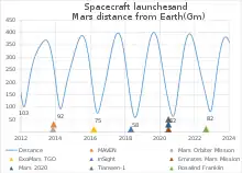 Ferestrele de lansare cu energie minimă pentru o expediție marțiană au loc la intervale de aproximativ doi ani și două luni (mai precis la 780 de zile, perioada sinodică a planetei față de Pământ).[6] În plus, cea mai mică energie de transfer disponibilă variază pe un ciclu de aproximativ 16 ani.[6] De exemplu, un minim a apărut în ferestrele de lansare din 1969 și 1971, ajungând la un vârf la sfârșitul anilor 1970 și atingând un alt nivel minim în 1986 și 1988.[6]
