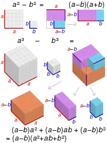- În următoarele identități, factorii pot fi adesea factorizați mai departe: