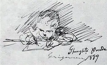 - „... Din umbra aceasta, din cuibușorul acesta ascuns în fundul unei mahalale din marginea Bucureștilor s-a ridicat marele Grigorescu... Singur s-a ridicat. Era un copil delicat, sfios, care se uita în juru-i cu ochii pururea proaspeți ai nevinovăției, ai acelei naivități divine care a fost farmecul puterii lui și care niciodată nu l-a părăsit. Și așa fraged și puțintel cum era, ardea de neastâmpăr, de setea de a zbura, de a pleca în lume, de a lupta, de a ispiti necunoscutul, vraja și primejdiile depărtărilor, tăcut și încrezător în el, ca prâslea cel năzdrăvan din basme. Cine știe dacă nu au într-adevăr presimțirea chemării lor pe lume copiii aceștia predestinați, în sufletul cărora, ca floarea în mugur, se pregătește să înflorească sufletul unui popor! Altfel, cum să înțelegi siguranța cu care se duc năzdrăvanii aceștia drept la ținta lor, cu toate și peste toate greutățile ce li se pun în cale?”