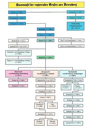 De Casa ducilor Henneberg aparținea ducatul cu același nume care era situat între regiunea Thüringer Wald și cursul râului Main întinzându-se până la râul Rhön. Când ducatul a avut întinderea cea mai mare, a ajuns până la districtele de azi Coburg și Sonneberg ca și localitățile Bad Salzungen, Ilmenau și Aschach situat pe râul Fränkische Saale. Pe teritoriul ducatului de odinioară din Turingia de Sud, Regiunea Francă care se află azi în landurile Bayern, Thüringen, Baden-Württemberg și Hessen. Familia Henneberg este o familie nobilă francă a cărui origine este atestată documentar din anii 1078.
