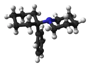Fenciclidina (PCP, fenilciclohexilpiperidină, denumită și „praful îngerilor”, engleză angel dust)[8] a fost utilizată în trecut ca anestezic general, iar în prezent se utilizează recreațional ca drog.[9] Induce halucinații, percepție alterată auditivă și comportament violent.[10] Este administrată de obicei prin fumat, dar se poate administra și oral, insufla sau injecta.[11]