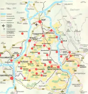 Munții Fichtelgebirge se află situați între orașele Hof și Weiden in der Oberpfalz. Spre vest, sunt legături bune de transport spre orașul vecin Bayreuth, iar la est spre Egerland. În centrul regiunii se află orașul Wunsiedel cu parcul natural Luisenburg. Localități mai importante din regiune de pe cursul superior al lui Eger și Röslau sunt: Marktredwitz, Marktleuthen, Arzberg, Röslau, Weißenstadt, Waldershof, Kirchenlamitz și Tröstau. Localități din sud și sud-est: Bischofsgrün, Fichtelberg, Nagel, Neusorg, Erbendorf, Wiesau și Fuchsmühl, iar în vest Weidenberg, Creußen, Bayreuth, Bindlach și Bad Berneck. În nord-vest și nord se află localitățile Gefrees, Zell im Fichtelgebirge, Weißdorf, Münchberg (pe Saale), Selb, Rehau și Hof. Din munții Fichtelgebirge izvorăște râul Saale.