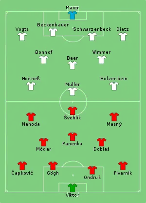 Finala a avut loc în fața a 30.790 de suporteri și a fost arbitrată de Sergio Gonella din Italia. Cehoslovacia a deschis scorul în minutul opt prin Ján Švehlík. La jumătatea primei reprize, Hans-Georg Schwarzenbeck l-a faultat pe Koloman Gögh, iar Marián Masný a executat lovitura liberă rezultată, mingea a fost respinsă de Franz Beckenbauer până la Karol Dobiaš, care a trimis din demivoleu pe lângă Sepp Maier, ducând scorul la 2-0. Patru minute mai târziu, Germania de Vest a redus deficitul, după ce Dieter Müller a trimis din voleu în poartă la centrarea lui Rainer Bonhof. În ultimul minut al timpului regulamentar, Germania de Vest a obținut un corner, iar Bernd Hölzenbein a marcat cu capul, meciul intrând în prelungiri.