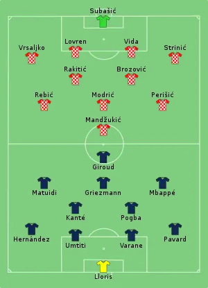 „Tactical Line-up – Final – France v Croatia”. FIFA.com(PDF)|format= necesită |url= (ajutor). Fédération Internationale de Football Association. 15 iulie 2018. |url= lipsă sau vid (ajutor); |access-date= necesită |url= (ajutor)