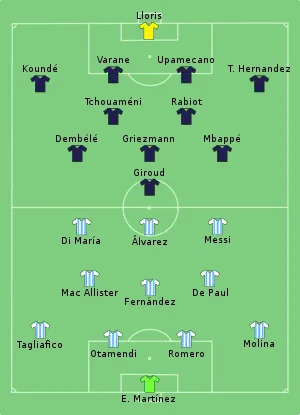 Argentina a deschis scorul printr-un penalti al lui Lionel Messi în minutul 23, înainte ca Ángel Di María să mărească avantajul în minutul 36, printr-un șut în colțul porții după un contraatac argentinian. Franța nu a reușit să înregistreze un șut pe poartă pentru marea majoritate a meciului, până când o dublă în doar 97 de secunde a lui Kylian Mbappé să egaleze scorul, 2–2 în minutul 81. În timpul prelungirilor, Messi a marcat din nou pentru a oferi Argentinei un avantaj de 3–2. Cu toate acestea, Mbappé a marcat un al doilea penalty pentru a egala 3–3 cu doar câteva minute rămase, devenind al doilea om care a marcat un hat-trick într-o finală a Cupei Mondiale după Geoff Hurst în 1966. Argentina a câștigat apoi loviturile de departajare care au urmat cu 4–2 pentru a obține a treia ei Cupă Mondială și prima din 1986.