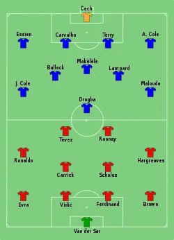 Manchester a ajuns în finala Ligii Campionilor în postură de campioană a Angliei pentru șaptesprezecea oară în istoria clubului, sezonul 2007/2008 și aproape neînvinsă în această competiție, pierzând doar jocul cu Fenerbahçe din prima rundă a sferturilor de finală. În Premier League s-au jucat două meciuri între cele două formații: 2-0 pe Old Trafford pentru Manchester united în primul meci pe banca londonezilor ca principal al lui Avram Grant și 2-1 pentru Chelsea în meciul retur de pe Stamford Bridge.