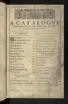 Cele 36 de piese ale ediției First Folio au fost aranjate în ordinea prezentată mai jos. Piesele care nu fuseseră publicate anteriror anului 1623, deși fuseseră cunoscute și jucate, au fost marcate cu un asterix (*). Fiecărei piese prezente îi este indicată tipul de resursă, determinată de cercetarea bibliografică specifică.[18]