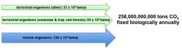 Aproximativ 258 de miliarde de tone de dioxid de carbon sunt convertite anual prin procesul de fotosinteză. Majoritatea carbonului este fixat în mediile marine, în special în mediile bogate în nutrienți. Cantitatea brută de carbon fixată este mult mai mare, deoarece aproximativ 40% din carbonul fixat este consumat prin respirație, proces care are loc după fotosinteză. [1] Luând în considerare amploarea fenomenului, este de înțeles că RuBisCO este cea mai des întâlnită proteină de pe Pământ.