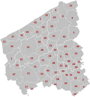 | Arondismentul Kortrijk: | Arondismentul Ypres: | Arondismentul Veurne: |