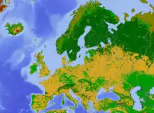 Harta utilizării terenurilor Europei: teren arabil (cu galben), pădure (verde închis), pășune (verde deschis) și tundra, sau mlaștini, în nord (galben închis)