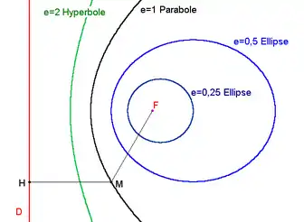 Definiția monofocală a unei conice utilizează conjunct un focar F și o dreaptă D numită directoare asociată. Conica apare ca mulțimea punctelor M din plan în așa fel încât . Potrivit valorii numărului real strict pozitiv e, numit excentricitate, mulțimea va fi o elipsă, o parabolă sau o hiperbolă.