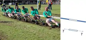 De exemplu, se consideră un sistem constând dintr-un obiect care este coborât vertical de o sfoară, cu tensiunea T, la o viteză constantă. Prin urmare, sistemul este în echilibru deoarece forța de întindere din sfoară, care trage în sus obiectul, este egală cu greutatea obiectului (o forță), mg (m este masa obiectului, iar g este accelerația gravitațională a Pământului), care trage în jos obiectul.[2]