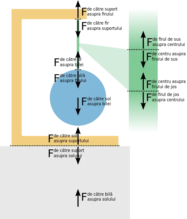 ![]() Forțele (F) din firul care ține suspendată bila |