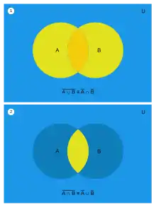 În teoria mulțimilor și algebra booleană, este adesea menționat ca „interschimbarea de reuniunii și intersecției în raport cu complementarea”,[6] care poate fi exprimată formal ca: