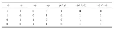 Pentru ca această afirmație să fie adevărată, una sau ambele dintre A sau B trebuie să fie false, pentru că dacă ambele ar fi adevărate, atunci conjuncția dintre A și B ar fi adevărată, făcând ca negația să fie falsă. Astfel, unul (cel puțin) sau mai multe dintre A și B trebuie să fie false (sau echivalent, unul sau mai multe dintre „nu A” și „nu B” trebuie să fie adevărate). Aceasta se poate scrie direct: