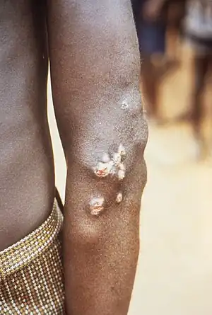 ![]() Noduli localizați în zona cotului ce pot rezulta dintr-o infecție bacteriană cu Treponema pallidum pertenue | |