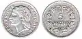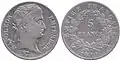 Monedă de 5 franci emisă în timpul Restaurației; avers, circular: LOUIS XVIII ROI DE FRANCE[16], bust spre stânga; revers, circular: PIÈCE DE 5 FRANCS[17], în centru sus este gravată coroana deasupra stemei regale (scut și trei flori de crin, dispuse în triunghi, cu vârful în jos); de o parte și de alta a scutului se află ramuri de măslin; în exergă: milesimul 1814, iar la dreapta, mai sus, litera K, semnul monetăriei din Bordeaux