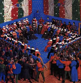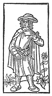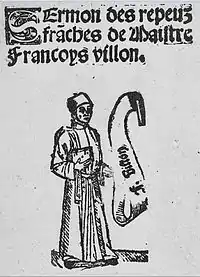 ![]() François Villon Portret imaginar din prima ediție a operelor sale (gravură pe coperta Marelui Testament, ed. Pierre Levet, 1489) | |