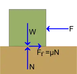 Frecarea este concretizată în calculele teoretice din fizică prin forța de frecare, (Ff), care este componenta tangențială la suprafața de contact dintre două corpuri a forței pe care unul din corpuri o exercită asupra celui de-al doilea.[1] Forța de frecare este nulă până în momentul în care forța externă F încearcă să miște corpul.[2] În timpul deplasării, forța de frecare are sens opus mișcării adică frânează mișcarea. Ea depinde de natura și de masa corpului și apare la alunecare și rostogolire. Totdeauna forța de frecare la alunecare este mai mare decât forța de frecare la rostogolire.[1]