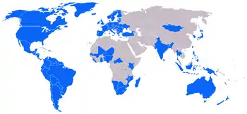 Democraţia la nivel global conform unui studiu efectuat de Freedom House în 2006Freedom in the World. Țările colorate în albastru au fost desemnate ca democrații liberale.