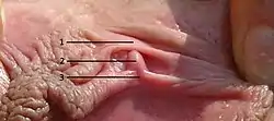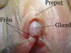 ![]() Partea vizibilă a clitorisului: 1 - Prepuț: 2 - Gland; 3 - Fren (frâu) | |