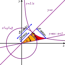 Deoarece aria unui sector de cerc cu raza r și unghiul u (în radiani) este , ea va fi egală cu u când r = √2. În diagramă, un astfel de cerc este tangent la hiperbola "xy" = 1 în (1,1). Sectorul portocaliu descrie o zonă și un unghi. Similar, sectoarele portocaliu și roșu prezintă împreună zona și mărimea unghiului hiperbolic.