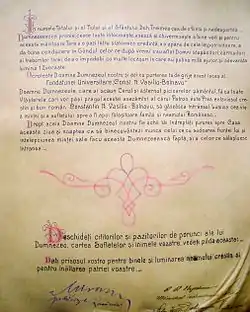 „Închinând și această danie națiunii și culturii Neamului Românesc, rugămintea mea se înalță ca un imn de laudă și mulțumire către Dumnezeu A-Tot-Puternicul care mi-a ajutat în toate și prin puterea de muncă ce mi-a dat am putut să adaug la celelalte binefaceri încă un prisos al muncii mele pentru binele și înălțarea culturală a neamului meu român, spre mulțumirea mea și a tuturor. Întru aceasta rog pe toți bunii români, oameni de bine și iubitori de țară, ca și pe urmașii nostri să dea binevoitorul lor concurs pentru ocrotirea și păstrarea acestui patrimoniu și să aducă la îndeplinire această a mea nestrămutată dorință. ”— C. N. Vasiliu Bolnavu, act de donație din 27 decembrie 1928[3]