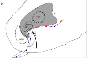 Un flux crestat în formă de V pe marginea celulei, deschizându-se departe de curentul descendent principal. Acest lucru indică fluxul divergent din jurul unui curent ascendent puternic.