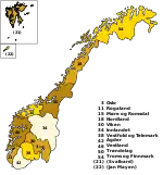 Aceste unități sunt grupate în cinci regiuni geografice. La rândul lor, unitățile fylker sunt subîmpărțite în 433 de comune. Capitala Oslo este considerată în același timp și comună, și fylke.