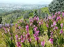 Peninsula Shale Fynbos, flora de pe Devils Peak, Cape Town.