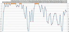 - Primul loc (14-record): 1957, 1959, 1961, 1963, 1964, 1965, 1966, 1967, 1971, 1972, 1985, 1986, 1987, 1988