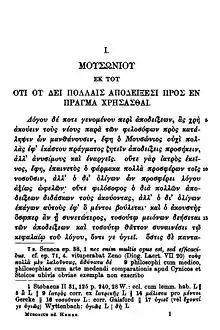Herod ne spune că „Musonius a ordonat să i se trimită o mie de sesterți unui șarlatan de genul celor care pretind a fi filosofi; mai multe persoane i-au spus că nu merită, că e un om rău, ticălos și bun de nimic. Musonius a răspuns cu un zâmbet, „ei bine, atunci merită banii”. (Fragmentul 50).