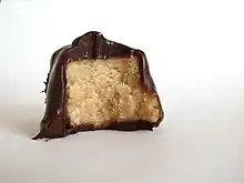 Un cub de ganaș acoperit de unt de arahide și ciocolată.