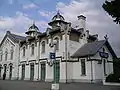 Arhitectul italian Giulio Magni a primit, în același an 1898, o comandă pentru realizarea a două gări (aproape identice) și a unei halte pe liniile Pitești - Curtea de Argeș și Adjud - Comănești - Ghimeș, ambele linii executate sub coordonarea inginerului român Elie Radu. Gările gemene din Curtea de Argeș și Comănești reprezintă o ilustrare a viziunii lui Magni asupra stilului național, el combinând elemente cu certe filiații în arhitectura romanică cu motive și materiale de tip oriental, asimilate pe filieră bizantină.[2]