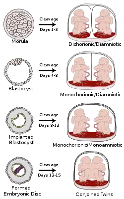 - gemeni siamezi. Scindarea are loc între zilele 13-15, separarea fiind incompletă, cei doi gemeni fiind conectați în unele părți ale corpului și putând avea deseori anumite organe în comun.