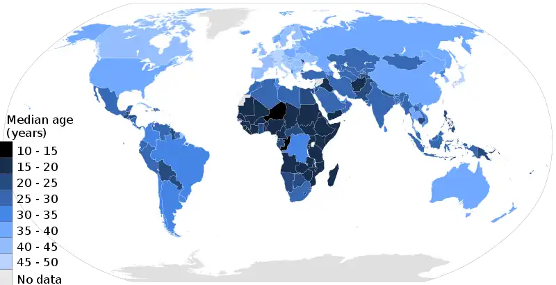 Proiecțiile statistice ale Națiunilor Unite în 2019 sugerează că, până în 2020, Nigerul va avea o vârstă medie de 15,2 ani, Mali 16,3, Ciad 16,6, Somalia, Uganda și Angola, toate 16,7, Republica Democratică Congo 17,0, Burundi 17.3, Mozambic și Zambia ambele 17.6. (Aceasta înseamnă că mai mult de jumătate din populațiile lor s-au născut în primele două decenii ale secolului XXI). Acestea sunt cele mai tinere țări din lume, după media de vârstă. În timp ce o populație în plină expansiune ar putea, teoretic, induce o creștere economică substanțială, neîndeplinirea nevoilor de asistență medicală și socială, de educație și economice produce șomaj cronic al tinerilor, productivitate scăzută și tulburări sociale. Investiția în capitalul uman este crucială în formarea unei societăți productive[39].