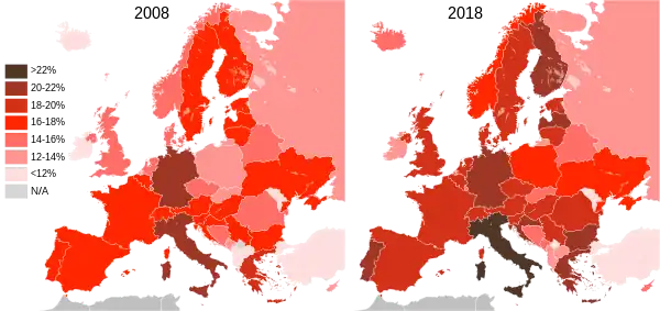 În Europa, deși ratele șomajului Franței și Italiei au rămas relativ mari, acestea au fost semnificativ mai mici decât anterior. Între timp, rata șomajului german a scăzut chiar sub cea a Statelor Unite, un nivel care nu a fost văzut de la unificarea sa cu aproape trei decenii înainte. [79] Eurostat a raportat în 2019 că rata totală a șomajului în Uniunea Europeană a scăzut la cel mai mic nivel din ianuarie 2000, cu 6,2% în august, ceea ce înseamnă că aproximativ 15,4 milioane de persoane au rămas fără un loc de muncă. Cehia (3%), Germania (3,1%) și Malta (3,3%) s-au bucurat de cele mai scăzute niveluri de șomaj. Statele membre cu cele mai mari rate ale șomajului au fost Italia (9,5%), Spania (13,8%) și Grecia (17%). Țările cu rate mai mari de șomaj față de 2018 au fost Danemarca (de la 4,9% la 5%), Lituania (6,1% la 6,6%) și Suedia (6,3% până la 7,1%). [81]