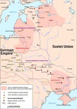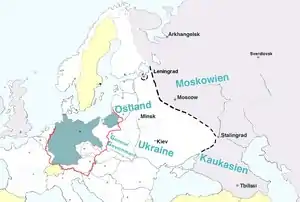 Gri deschis - aria teritorială planificată a unităților administrative ale Reichskommissariatelor; denumirile lor în albastru sunt Ostland (1941-1945), Ukraine (1941-1944), Moskowien (nerealizat) și Kaukasien (nerealizat).