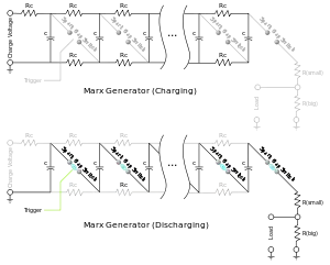 Un număr de condensatori sunt încărcați în paralel cu o tensiune (U), apoi conectați în serie cu ajutorul unor întrerupătoare deschise (în care se formează o scânteie) și descărcați, producând o tensiune egală cu U înmulțit cu numărul de condensatoare.