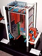 În 1867, în SUA, George Herman Babcock și Stephen Wilcox au conceput un cazan „care nu explodează”, cazan la care nu gazele de ardere, ci apa circula prin interiorul țevilor.[11] Deoarece se puteau folosi diametre de țevi mai mici, s-au putut obține coeficienți de transfer termic mai buni și suprafețe, deci producții de abur, mult mai mari, iar volumul de apă care era în instalație la un moment dat era mai mic. Țevile cu diametru mic explodau mai greu, justificând afirmația inventatorilor.