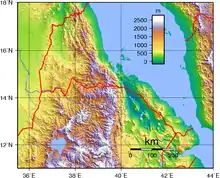 Teren: dominat de extinderea zonelor înalte etiopiene pe direcția nord-sud, coborând spre est spre o câmpie deșertică de coastă, spre nord-vest până la un teren deluros și spre sud-vest până la câmpii.