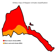 Eritreea poate fi împărțită în trei zone climatice majore: zonele înalte centrale, regiunea de coastă și zonele joase din vest. Fiecare are un model climatic diferit. Conform clasificării climatice Köppen, Eritrea are fie un climat semi-arid fierbinte (BSh), fie un climat de deșert cald (BWh), deși temperaturile sunt mult moderate la cele mai mari altitudini.[1]