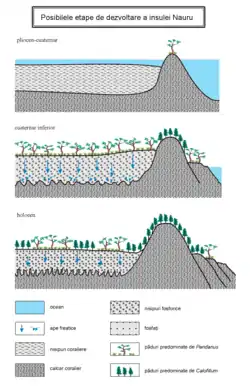 În schema evoluției geologice a insulei, prezentată alături, există două momente îndoielnice. În primul rând, este ambiguu procesul descris de formare a reliefului local. Pe lângă ipoteza că relieful a fost supus carstificării și calcarul coralier s-a dizolvat în apa oceanului, a fost lansată o altă teorie. Pe litoral și în apele de mică adâncime cu fundul pietros se găsesc, mai ales în partea estică a țării, o cantitate mare de coloane scurte de pietre, care într-un timp foarte lung au fost erodate de valuri. Astfel, oceanul a acționat decisiv asupra regiunilor de mică adâncime în timpul ridicării insulei. În orice caz, acest teritoriu nu a fost protejat, astfel în reciful care înconjura deja insula au început să se formeze trecători largi. Ridicarea de mai departe a insulei a condiționat spălarea ei, iar apa de ploaie a netezit coloanele de piatră.