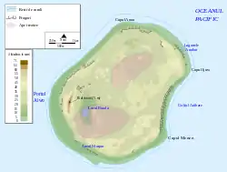 O plajă nisipoasă înconjurată de un recif de corali se ridică în jurul solului fertil. Platoul fosfatic înălțat („Puntea”) acoperă partea centrală a insulei. Cel mai înalt punct de pe insulă are 61 de metri deasupra nivelului mării.