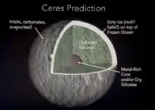 S-a sugerat că un strat rămășită de apă lichidă (sau ocean noroios) ar fi supraviețuit până în prezent sub un strat de gheață.[8][9] Măsurătorile făcute de Dawn confirmă că Ceres este parțial diferențiat și are o formă de echilibru hidrostatic, cel mai mic corp în echilibru cunoscut.[10]